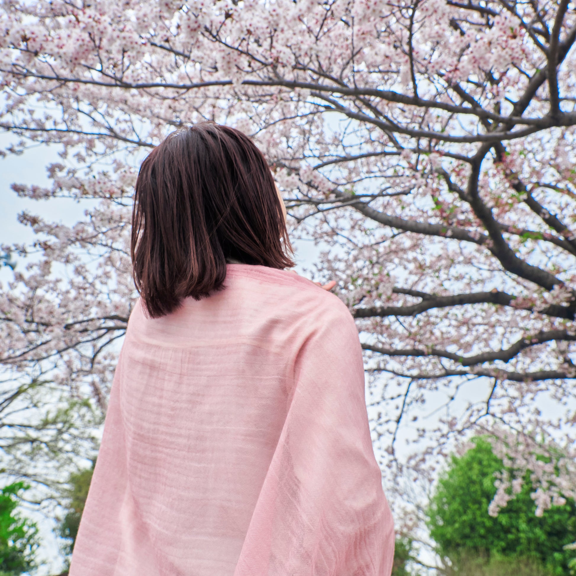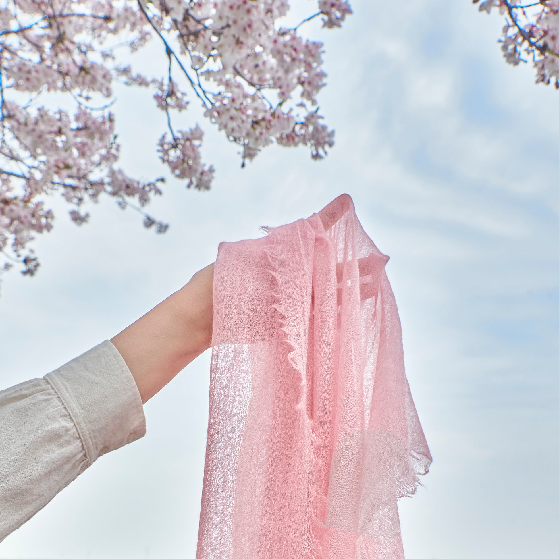 冬のイメージが強いですが、薄手のカシミヤガーゼは一日の中で寒暖差が激しい春、秋にもおすすめです。薄手のコートに衣替えしたけれど、朝晩はまだ少し肌寒い、そんなときに春の色を纏いながら、寒さの対策も出来る頼れるストールです。